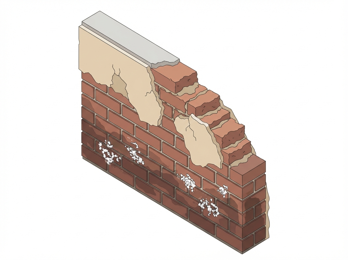 - Odstranit omítky 100 cm NAD hranici vlhkosti — ne jen tam kde je vidět poškození