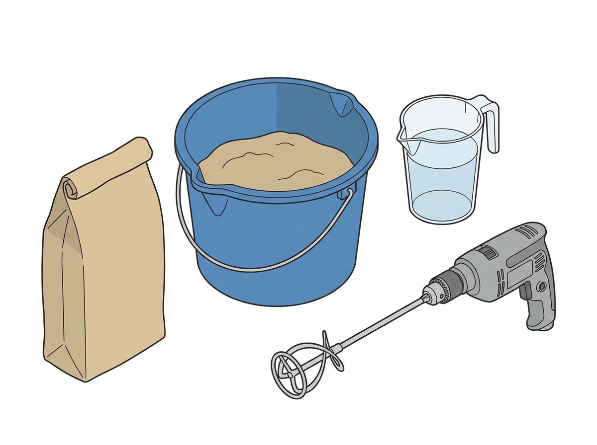 1l vody → celý pytel (7 kg) → dolít na 2,9–3,2l. Míchat 5–7 min (400–500 ot/min), odstát, znovu promíchat.